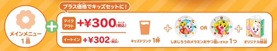 メインメニュー1品にプラスして、キッズドリンク1杯としまじろうデザインの食器1つ、オリジナル紙袋をセットで購入できます。しまじろうデザインの食器は、第1弾では「しまじろうのつよいこグラス」、第2弾では「しまじろうのメラミンおやつ皿」が提供されます。また、第1弾のみ知育DVD「しまじろうとチャレンジ!DVD」がセットになっています。