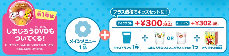 第1弾の販売商品はポン・デ・リング生地の「しまじろうのドーナツ」2種と、「しまじろうのつよいこグラス」と知育DVD「しまじろうとチャレンジ!DVD」がドーナツやドリンクとセットになった「ミスド こどもちゃれんじ キッズセット」(以下:キッズセット)です。第2弾では、イースト生地の「しまじろうのドーナツ」2種と、キッズセットでは「しまじろうのメラミンおやつ皿」が提供されます。