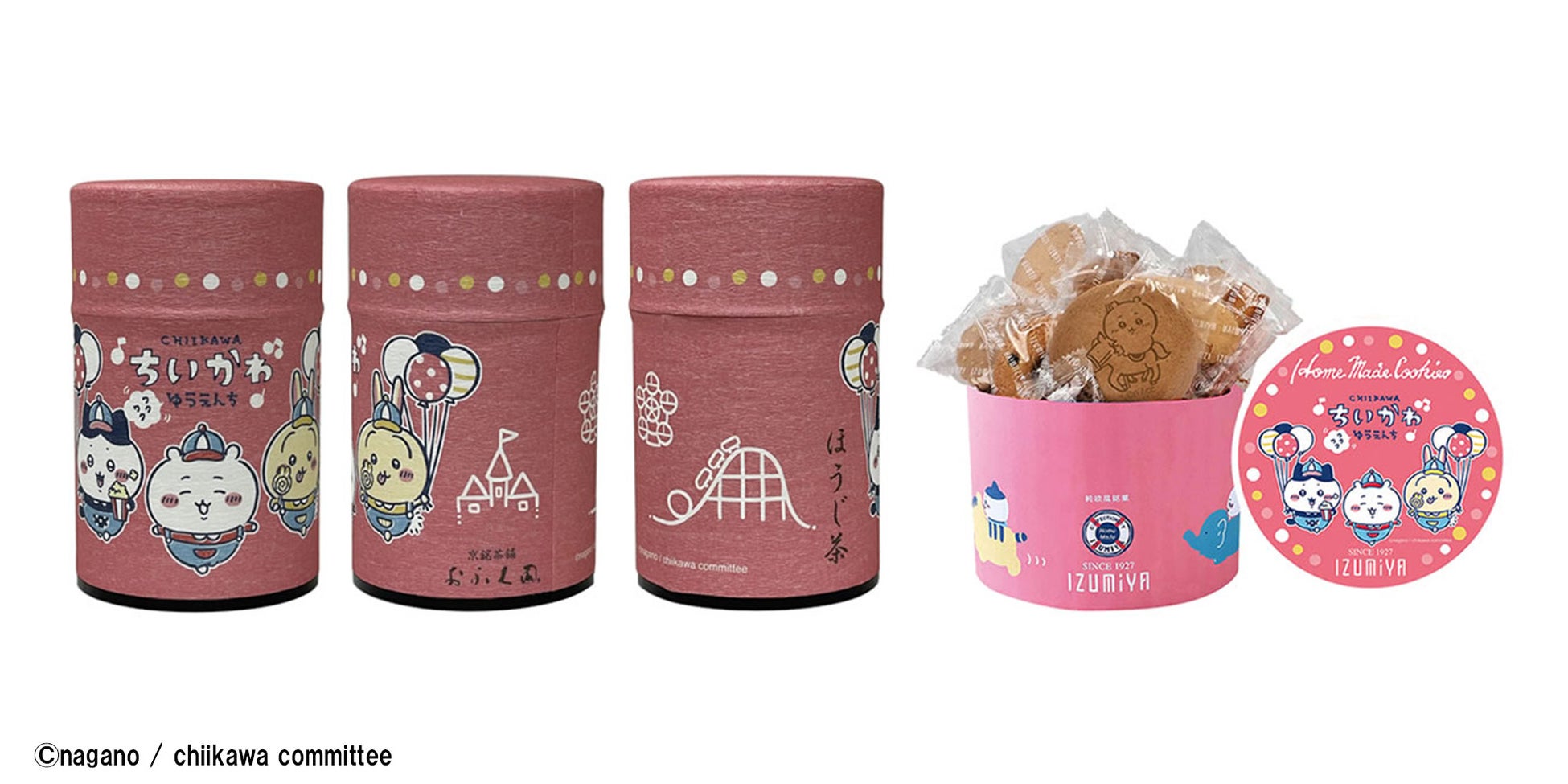ナガノ先生直筆サイン入りのアートフレーム(注1)をはじめ、どら焼き、カステラ、クッキー、せんべいなどのお菓子、ほうじ茶がラインナップ。カプセルトイでは、「ワクワクゆうえんち」と「ちいかわ×サンリオキャラクターズ」のイラストをそれぞれ使用したアクリルスタンドinカプセルと缶バッジinカプセル(注2)が販売されます。