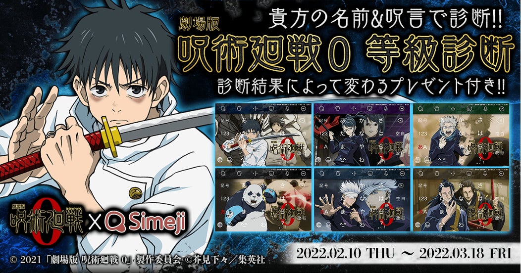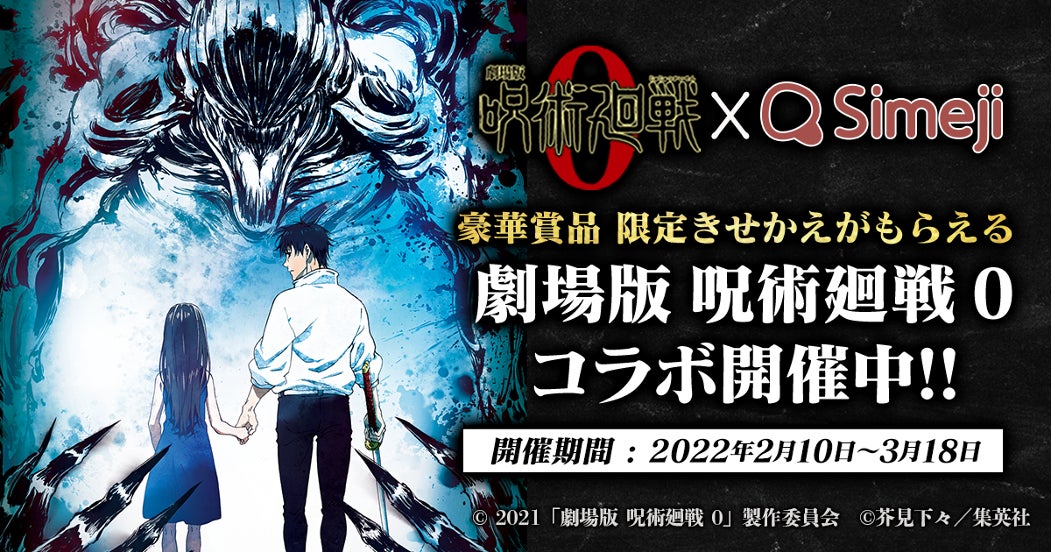バイドゥ株式会社が提供する日本語入力&きせかえ顔文字キーボードアプリ「Simeji」(iOS、Android版)は、2022年2月10日より「劇場版 呪術廻戦 0 × Simejiコラボキャンペーン」が開始されます。本キャンペーンでは、豪華賞品が当たるSNSきせかえシェアキャンペーンや、Simejiオリジナルきせかえが当たる「劇場版 呪術廻戦 0×Simeji等級診断」が2022年2月10日より2022年3月18日(金)まで実施予定です。