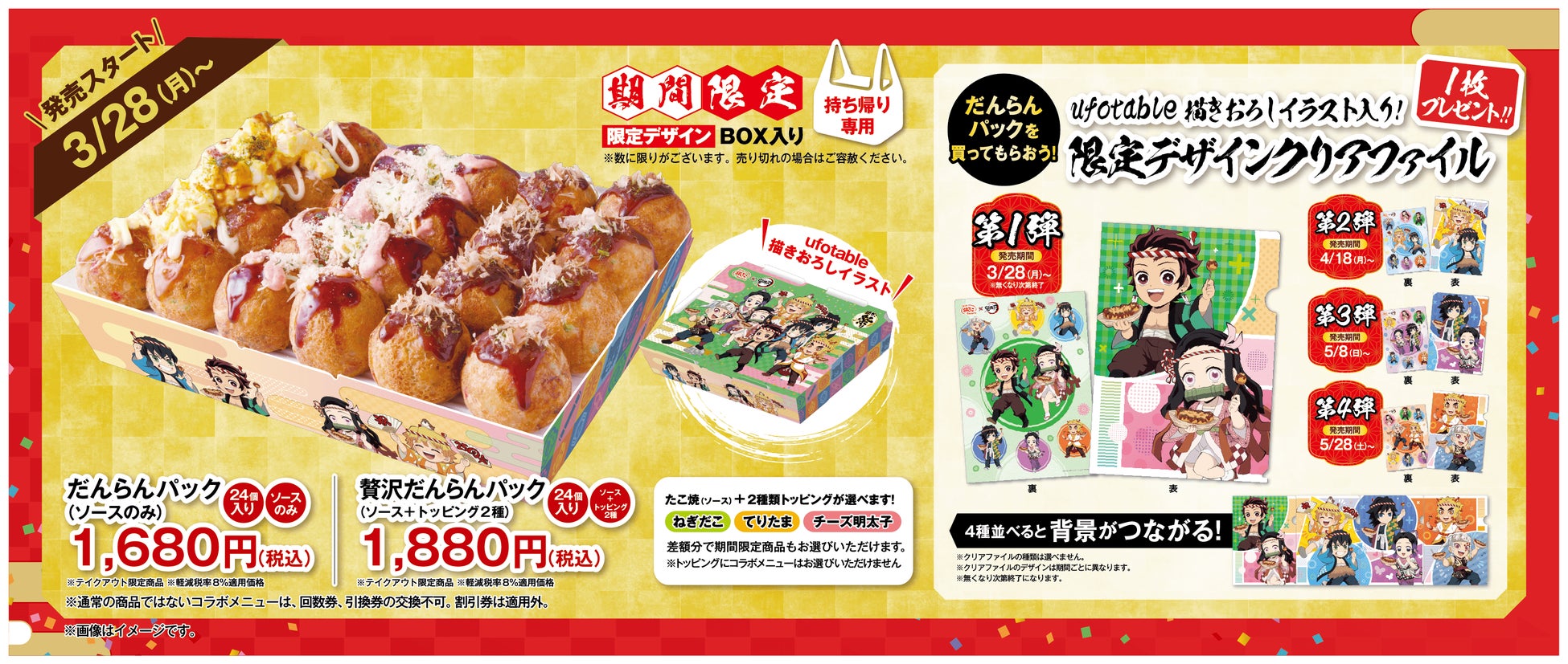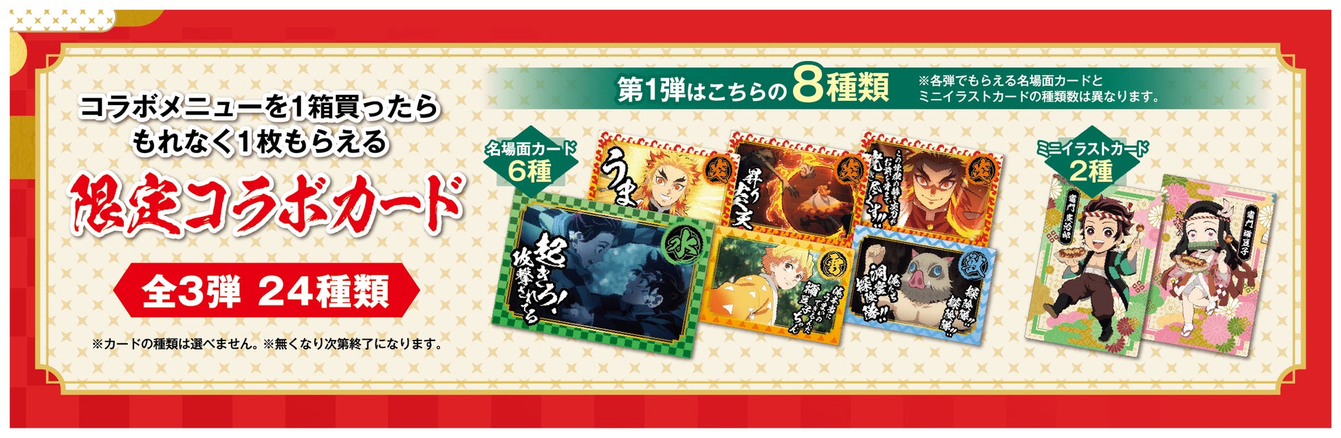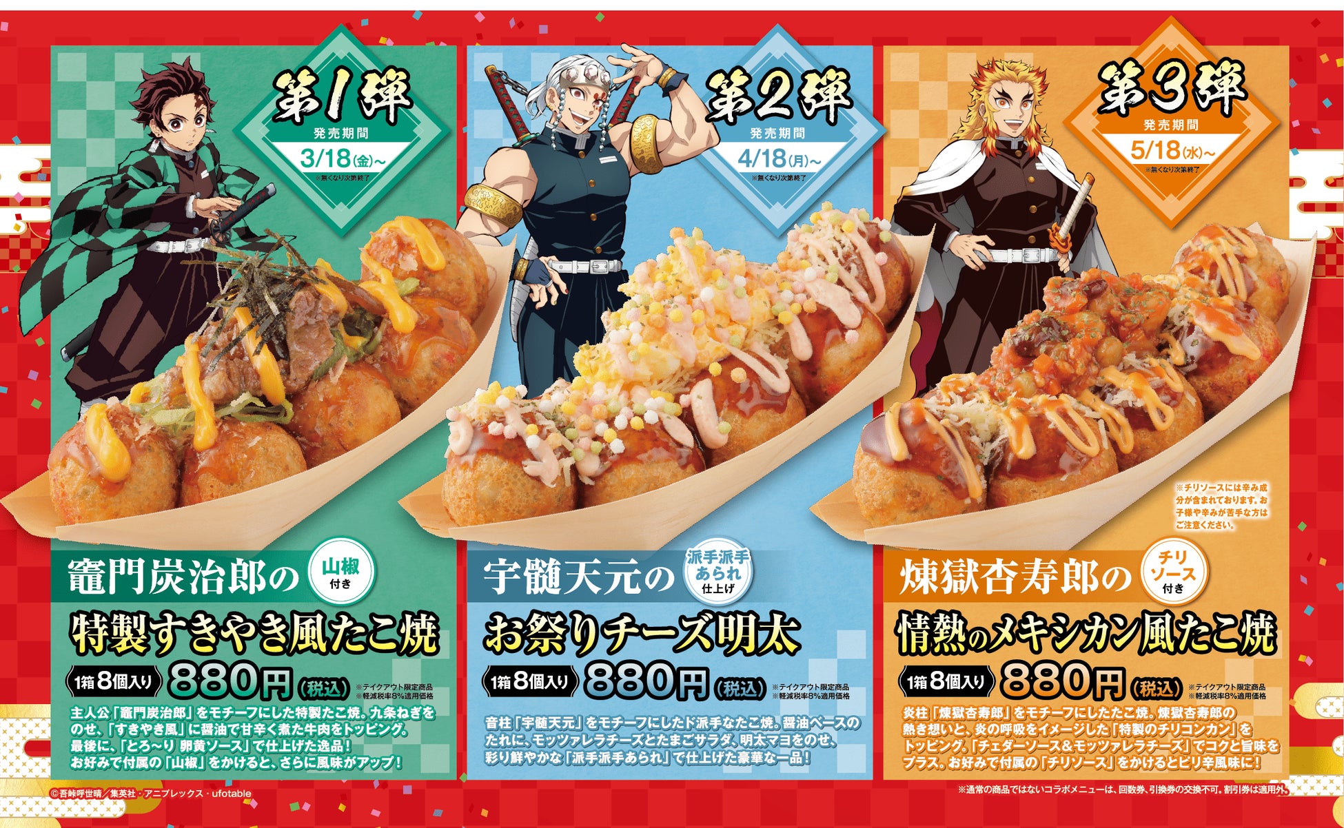 商品概要:主人公の竈門炭治郎らをイメージした 「当コラボ限定のたこ焼」 を、オリジナルデザインの特装箱に入れ発売。当コラボたこ焼1舟ご購入で、限定コラボカードが1枚もらえます。