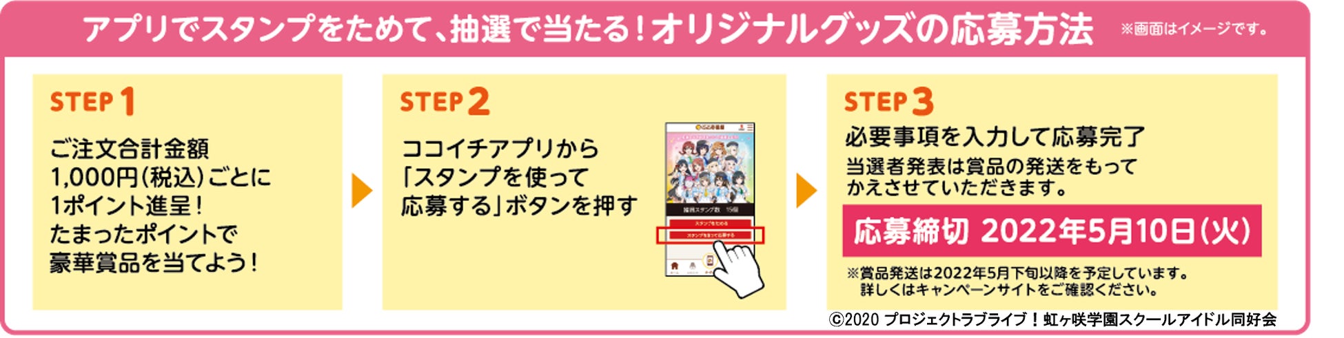 「A3ポスター」、「カレーハウスCoCo壱番屋/パスタ・デ・ココ共通お食事券1,000円分(税込)」が抽選で当たります。