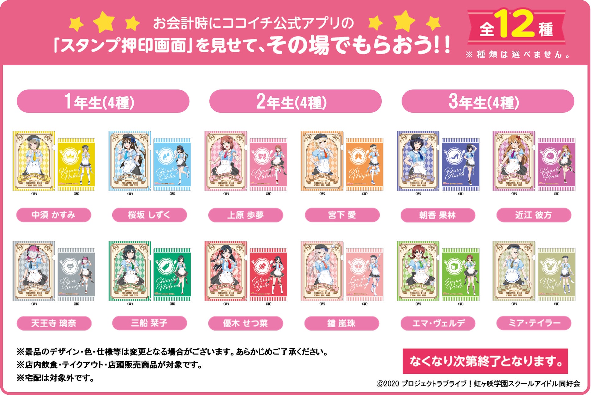カレーハウスCoCo壱番屋、あんかけスパゲッティパスタ・デ・ココは、「ラブライブ!虹ヶ咲学園スクールアイドル同好会」とコラボしたキャンペーンを4月1日(金)から開催!「その場でもらえる!ココイチオリジナルクリアファイル」や「アプリでスタンプをためると、抽選で当たる!」企画が実施!キャンペーン概要、詳細、期間、貰い方・抽選方法などの情報を紹介します。
