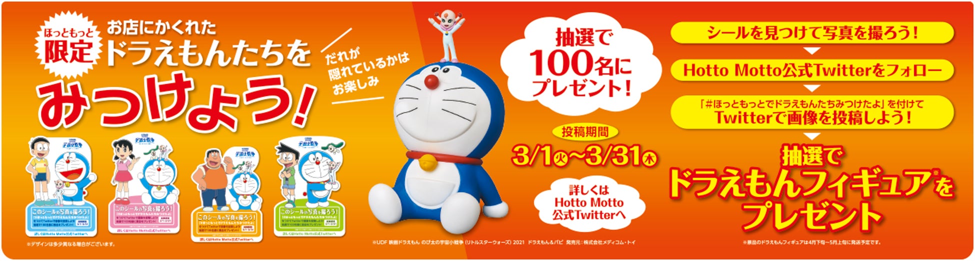 3月1日(火)より31日(木)の期間中に、「ほっともっと」のお店に隠れた『ドラえもん』に登場するキャラクターのシールを撮影し、「ほっともっと」公式Twitterのフォロー&指定のハッシュタグを付けて画像を投稿すると、抽選で100名様にドラえもんフィギュアがもらえるキャンペーンが開催されます。お店によって、どのキャラクターのシールが隠れているかはお楽しみです。お店とTwitterで『映画ドラえもん』を楽しんでみてはいかがでしょうか。
