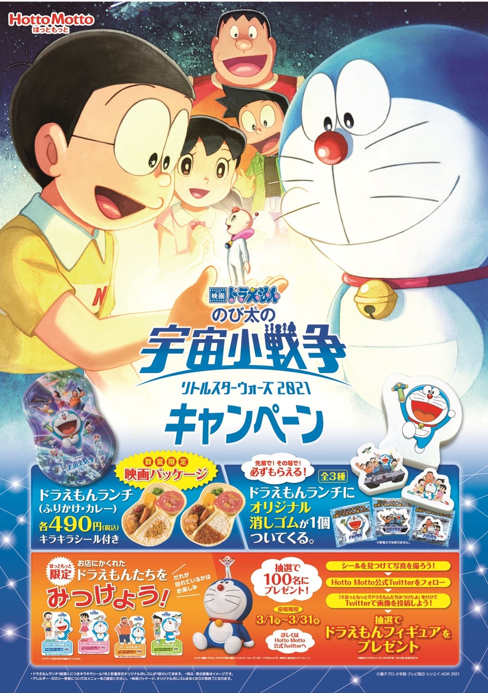 このたび『映画ドラえもん のび太の宇宙小戦争(リトルスターウォーズ) 2021』の公開を記念して、映画パッケージの『ドラえもんランチ』490円が、3月1日(火)より数量限定で販売されます。また、同商品を購入した方に「ほっともっと」オリジナルの消しゴムがプレゼント。さらに同日より、お店とTwitter連動のキャンペーンも実施予定です。