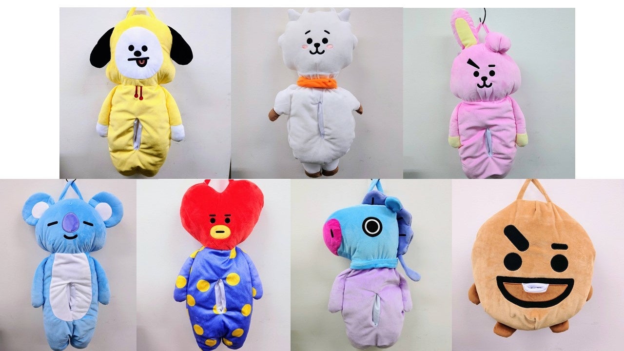 BT21のそれぞれのキャラクターを立体表現したぬいぐるみティッシュボックスカバー。室内・車内でもぶら下げて使えます。