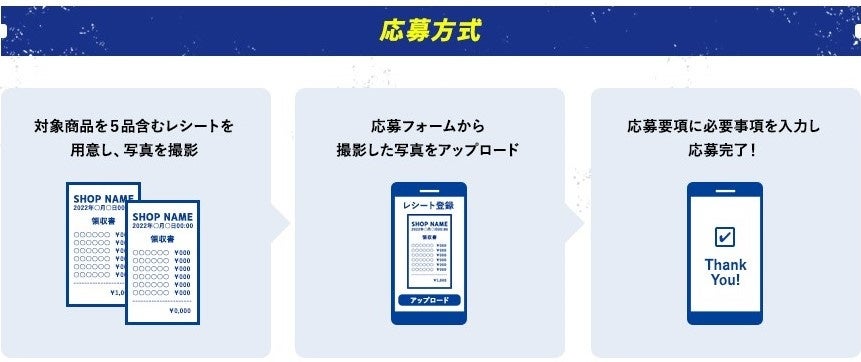期間中、対象商品いずれか5点を含むレシートをアップロードして応募した方の中から抽選で合計60名様に描き下ろしデザインの豪華景品をプレゼントされます。期間中、お一人さま何口でも応募できますが、当選はお一人様1回までです。使用できるレシートは、キャンペーン期間中に購入されたもののみとなります。