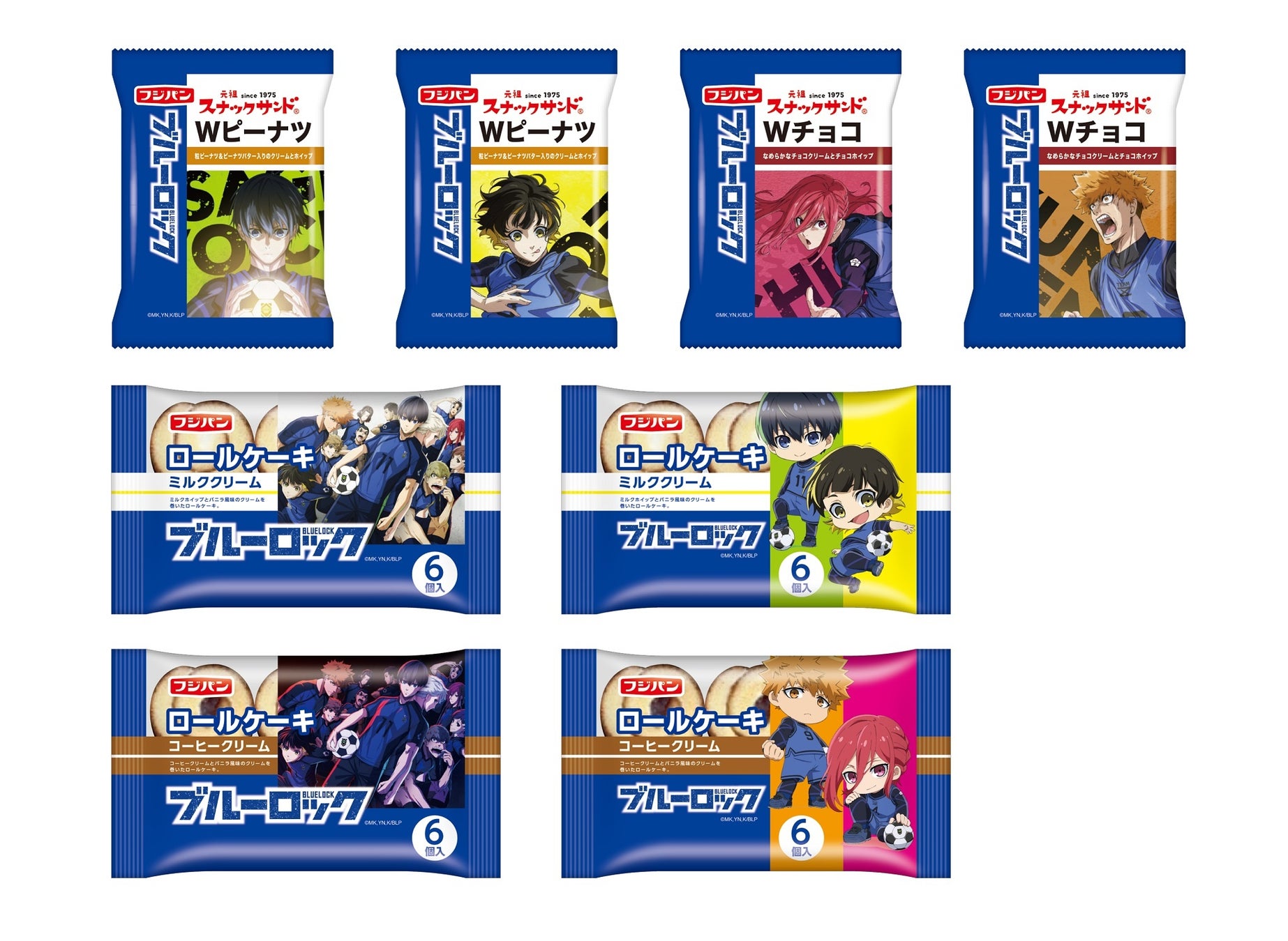 「ブルーロック」は、2021年第45回講談社漫画賞を受賞したサッカー漫画となっており、2022年10月にアニメ化が決定しました。今回のコラボレーションでは、アニメ作品の前半から活躍するキャラクターたちがパッケージに登場、各商品2種類ずつで展開いたします。2022年9月から11月の間、毎月新商品が登場いたします。9月は「スナックサンドWピーナツ」「スナックサンド Wチョコ」「ロールケーキミルククリーム」「ロールケーキコーヒークリーム」の4品展開となります。9月の限定デザインは、主人公の「潔 世一 (いさぎ よいち)」、のほか、「蜂楽 廻 (ばちら めぐる)」、「國神 錬介 (くにがみ れんすけ)」、「千切 豹馬 (ちぎり ひょうま)」といったメインキャラクターを中心とした全8種類です。登場人物の個性的な表情と躍動感のあるイラストが特徴となっています。